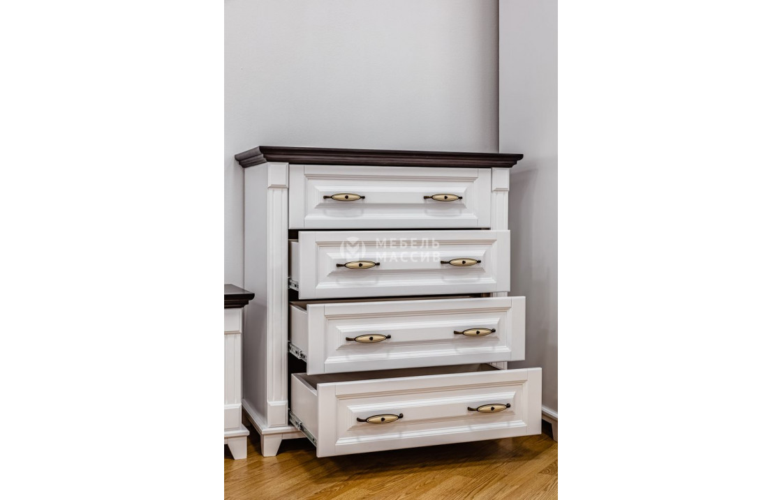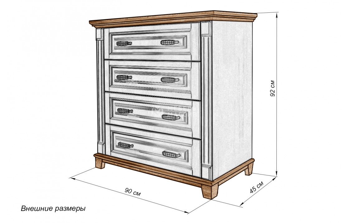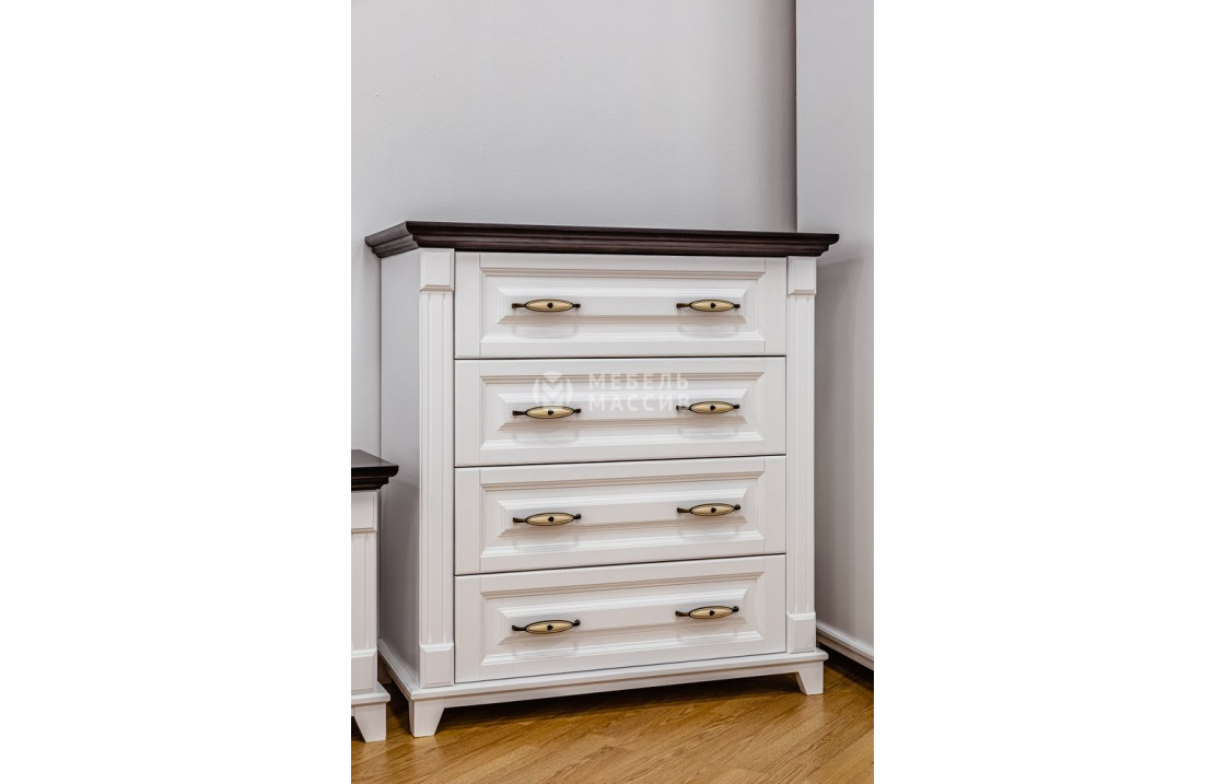 искусно выполненный Комод Прованс Браун (белая эмаль + Венге 3) сделан из массива сосны, имеет четыре вместительных ящика с ручками, декоративную резьбу и ножки для защиты напольного покрытия. цвета основания и столешницы контрастируют с цветом корпуса и ящиков. изделие можно купить в интернет-магазине по выгодной цене.| Размер | Цена | |