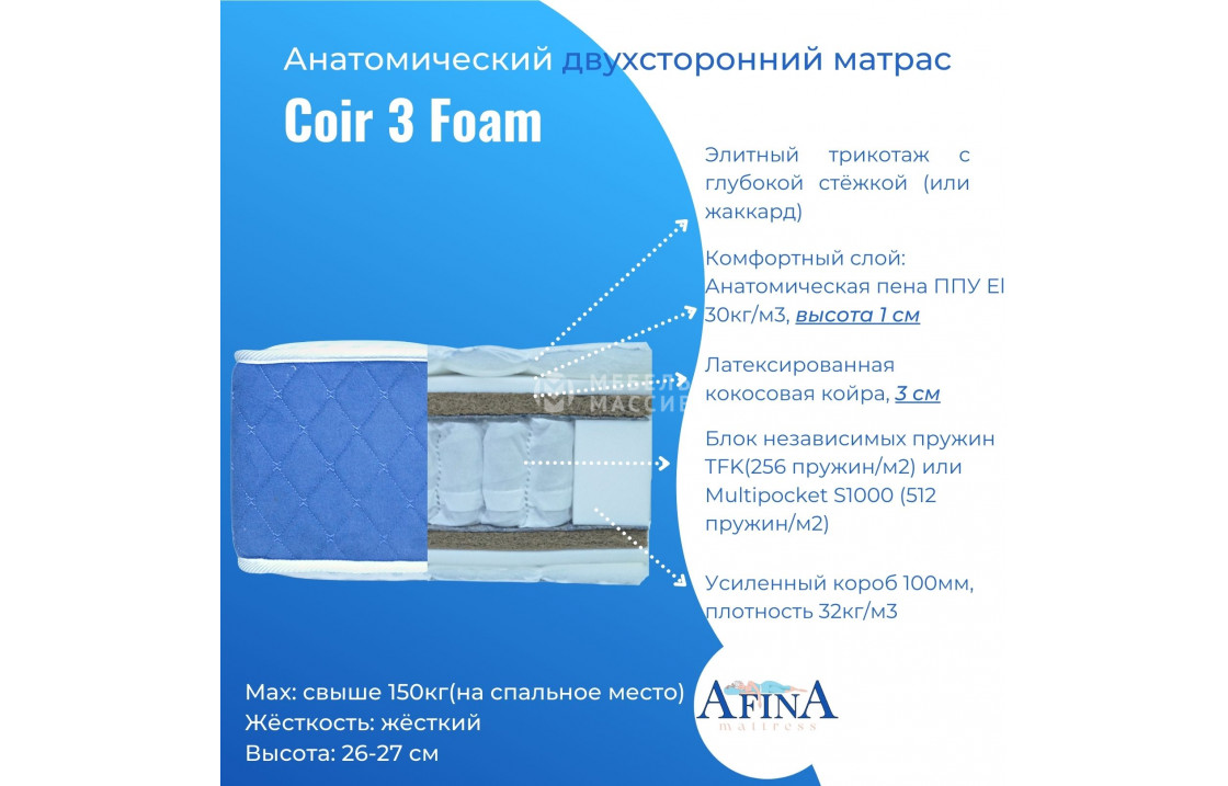 двусторонний Coir 3 от фабрики афина с пружинным блоком tfk-256 (256 пружин на кв. метр) или multi-512 (512 пружин на кв. метр) на выбор. чехол жаккард стёганный 180-220 гр/м2 или элитный трикотаж с объёмной стёжкой 300гр/м2 на выбор. купите по цене производителя в интернет-магазине мебель массив.| Размер | Цена | |
