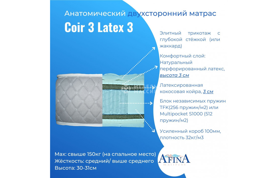 двусторонний Матрас Coir 3 Latex 3 / Coir 3 от фабрики афина с пружинным блоком tfk-256 (256 пружин на кв. метр) или multi-512 (512 пружин на кв. метр) на выбор. чехол жаккард стёганный 180-220 гр/м2 или элитный трикотаж с объёмной стёжкой 300гр/м2 на выбор. купите по цене производителя в интернет-магазине мебель массив.| Размер | Цена | |