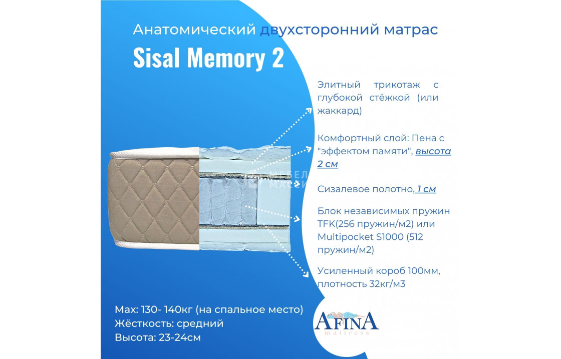 двусторонний Матрас Sisal Memory 2 / Coir 2 от фабрики афина с пружинным блоком tfk-256 (256 пружин на кв. метр) или multi-512 (512 пружин на кв. метр) на выбор. чехол жаккард стёганный 180-220 гр/м2 или элитный трикотаж с объёмной стёжкой 300гр/м2 на выбор. купите по цене производителя в интернет-магазине мебель массив.| Размер | Цена | |