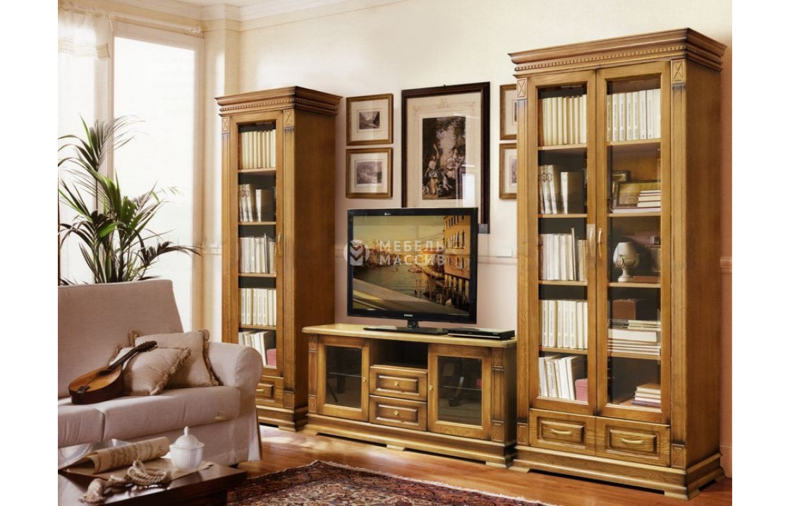 Гостиная Флоренция-4 из натурального массива дерева прекрасно впишется в большую комнату, выполненную в классическом стиле. В данном наборе есть два больших шкафа, имеющих деревянные полки за застекленными створками, а также выдвижные ящики в нижней части. Помимо шкафов в комплекте идет тумба под ТВ, также располагающая выдвижными секциями и полками за распашными дверцами. Функционал гарнитура позволит разместить большой объем разнообразных предметов, начиная от книг и печатных изданий, а заканчивая декоративным антиквариатом, посудой и фоторамками.| Размер | Цена | |