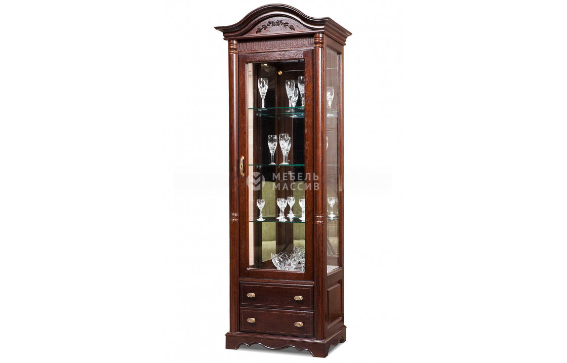 Сервант Валео прекрасно дополнит интерьер кухни или столовой, созданных в едином с ним стиле. Мебель изготовлена из цельного массива сосны, что гарантирует надлежащее качество и долговечность при эксплуатации. Модель обладает хорошим функционалом. Состоит как бы из двух частей: верхний модуль позволяет увидеть элитную посуду или элементы декора на стеклянных полках за прозрачной дверкой, а нижняя часть образована двумя выдвижными ящиками на направляющих для скрытного хранения вещей и различных аксессуаров. Дизайнерами украшен и внешний вид мебели. Применены такие художественные приемы как резьба по дереву, декорирование цветочными элементами и красивая фурнитура. Цвет мебели выбирается индивидуально. Доставка %rs_city_po% и %rs_po_oblasti%.| Размер | Цена | |