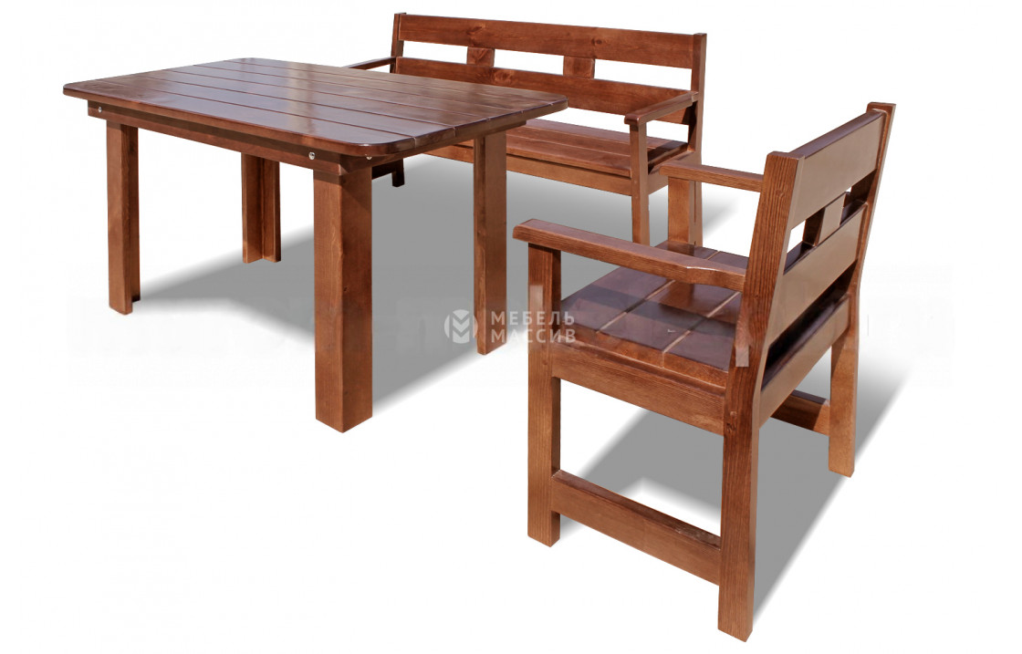 Набор мебели Русич – выгодный вариант для тех, кто не хочет отдельно приобретать несколько предметов. Набор включает в себя стол, лавку и кресло, которые более всего подойдут для размещения в дачном доме. Дизайн всех изделий выдержан в едином минималистичном стиле, в качестве материала изготовления выступает сосновый массив. Данное дерево превосходно переносит высокую влажность, поэтому мебель можно поставить даже на открытой террасе, не боясь растрескивания поверхностей и появления грибков и бактерий. Доставка %rs_city_po% и %rs_po_oblasti%.| Материал | сосна |